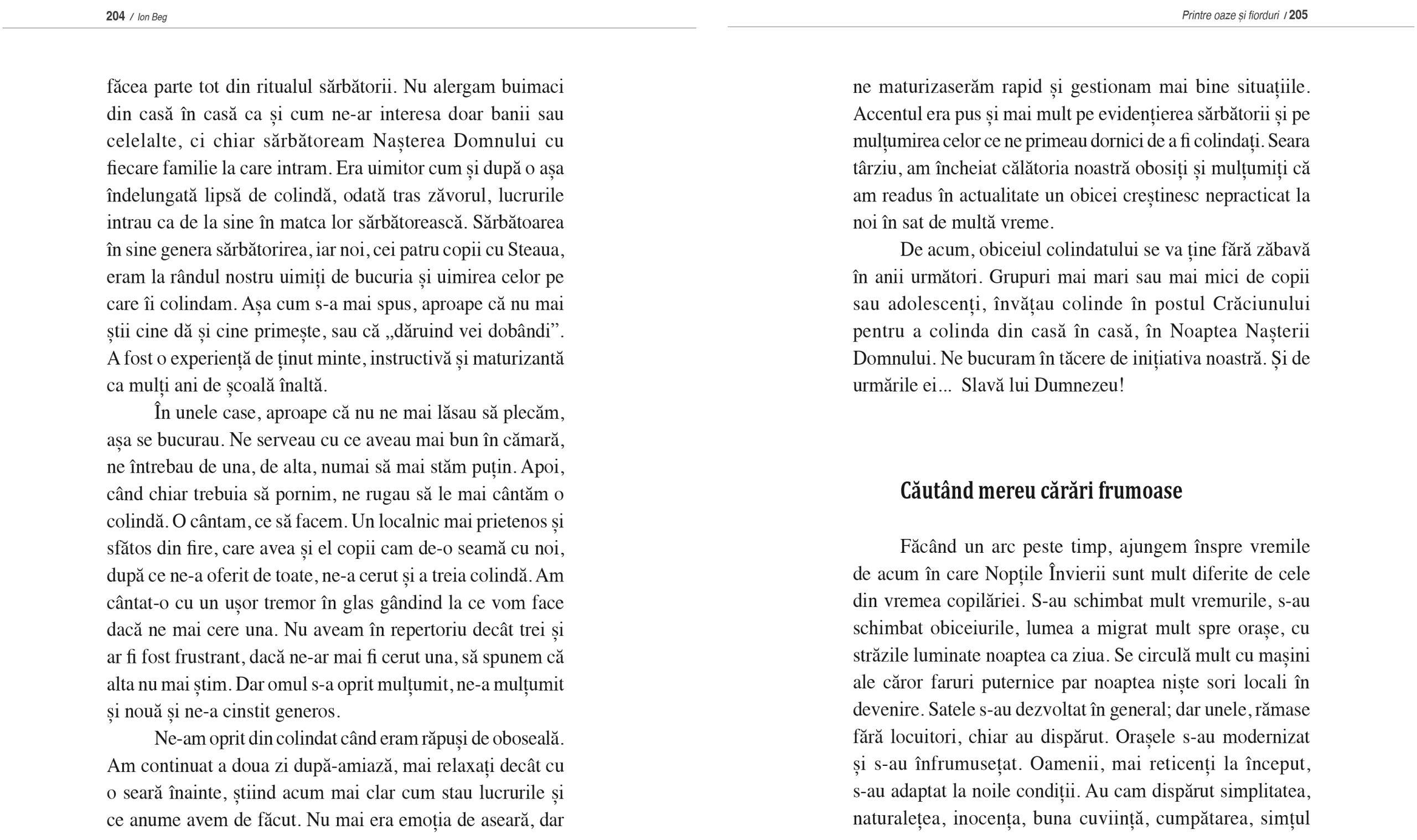 Explorându-şi trecutul cu onestitate, scriitorul Ion Beg recreează elegant un farmec aparte, decupat cu decenţă şi tact, dintr-un parcurs întins pe mai mult de jumătate de secol. Privind moartea în faţă, rătăcind pe deal în via bunicului ori colindând cu Steaua prin satul natal, năzdrăvănie adolescentină care schimbă o cumunitate, Ion Beg ne deschide uşi spre noi înşine şi spre traumele sau bucuriile care i-au marcat destinul.